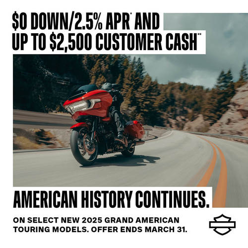 *Financing Offer available only on select, new untitled 2025 or 2024 Street Glide® and Road Glide® or 2025 Street Glide® Ultra Harley-Davidson® motorcycles financed through Eaglemark Savings Bank and is subject to credit approval. Harley-Davidson® CVO™ motorcycles are excluded. Not all applicants will qualify as the Annual Percentage Rate (APR) will vary based on the applicant’s past credit performance and the term of the loan. Financing offer is available only for up to a 36-month term. For example, a 2025 Road Glide motorcycle in Brilliant Red with Black trim and an MSRP of $30,199, no down payment and amount financed of $30,199, 36-month repayment term, and 2.50% APR results in monthly payments of $871.58. In this example, customer is responsible for applicable taxes, title, licensing fees and any other fees or charges at the time of sale. APR is calculated according to the simple interest method. Not valid in conjunction with other offers. Customer must take delivery by March 31, 2026. This Financing Offer is valid during the period of January 1, 2026 to March 31, 2026. Other terms, conditions, and limitations may apply. Dealer participation may vary. Financing offer is subject to change or cancellation at anytime. See dealer for details.